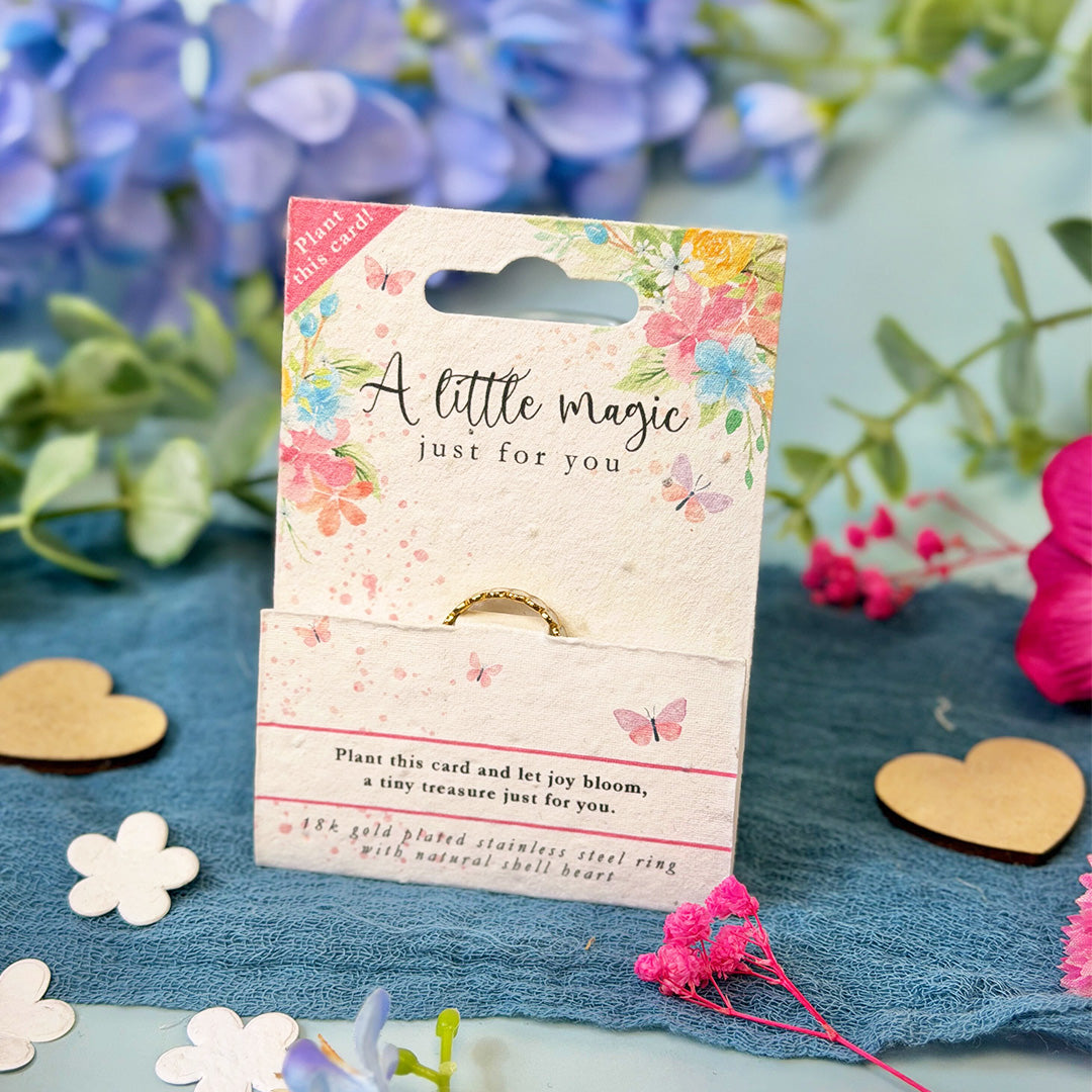 Delicate, timeless, and eco-conscious – the Wild Heart ring is the perfect blend of beauty and sustainability. Featuring elegant hearts made from natural shell, this piece is crafted to add a soft, feminine charm to any outfit.